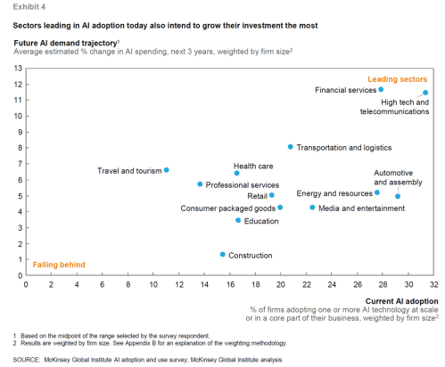 It’s fascinating to see the level of current AI adoption compared with the AI demand trajectory. Of particular interest is MGI’s opinion that “variation of adoption within industries will be even larger than between industries.” That means, I think, that the AI divide – the haves and have nots – won’t be so much defined by industry as by early adoption status and investment. I can see a future bifurcated by this variable. This means that every organization, regardless of industry, has the ability now to decide to on the side of early adoption and industry disruption.