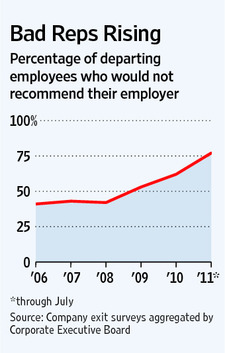 • Over the last 6 years, the percentage of departing employees who would not recommend their employer has grown from 42% to 75%, according to company exit surveys aggregated by Corporate Executive Board
